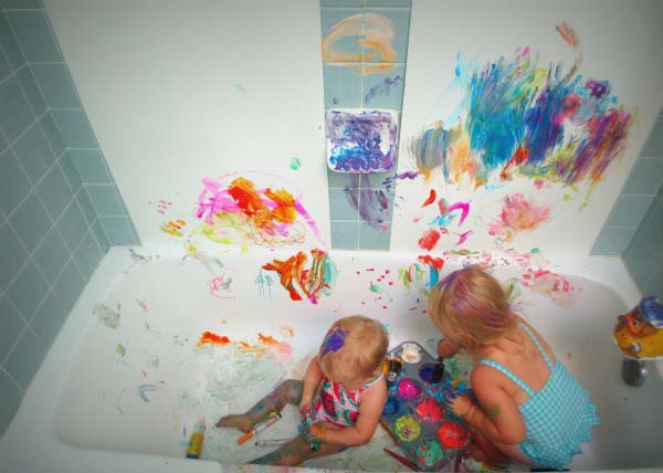 Per facilitare la pulizia e fare un’attività divertente, potreste far dipingere i vostri bambini direttamente nella vasca da bagno utilizzando colori lavabili.