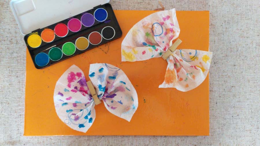 (il foglio di carta assorbente diventerà le due ali della nostra bellissima farfalla). Una volta passato il tempo utile per farlo asciugare farete una leggera arricciatura centrale dove posizionerete la molletta di legno che fungerà da corpo. La molletta si può decorare con i pennarelli disegnando gli occhi e le antenne.