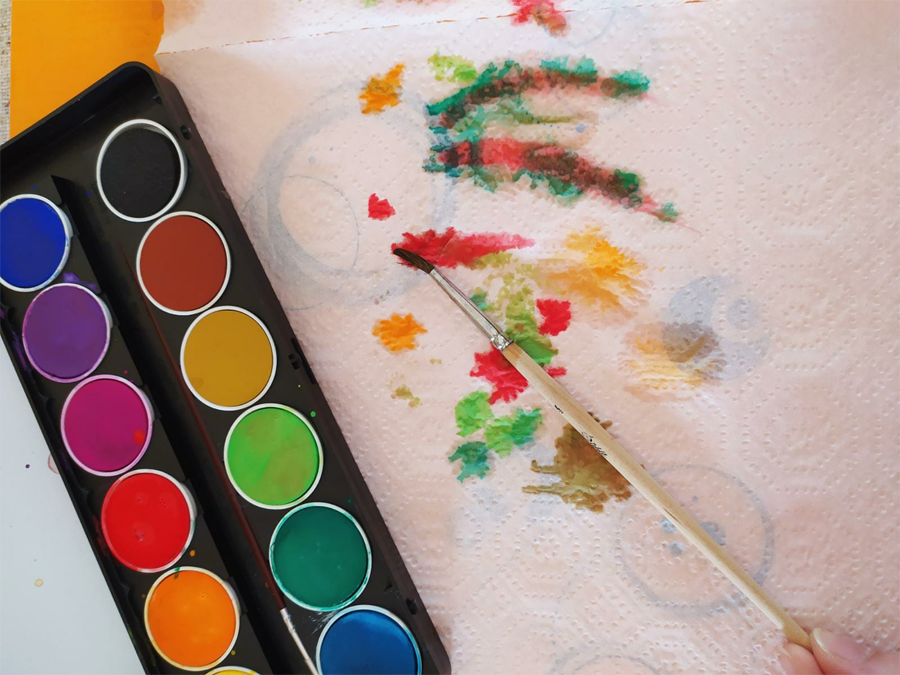 Per prima cosa i bambini si divertiranno a dipingere, con i colori preferiti, il foglio di carta assorbente con un pennello e gli acquarelli