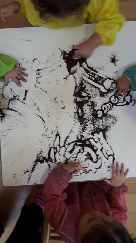 Disporre il vassoio su un tavolo (comodo per il bambino) e riempirlo con uno strato di polvere di cacao.