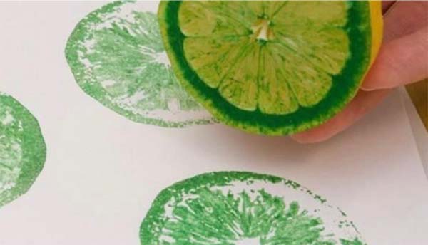 Utilizziamo la frutta per “costruire” dei timbrini originali, basterà scegliere quella che vogliamo utilizzare, tagliarla e stendere la tempera su uno dei lati tagliati.