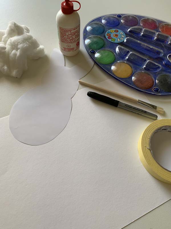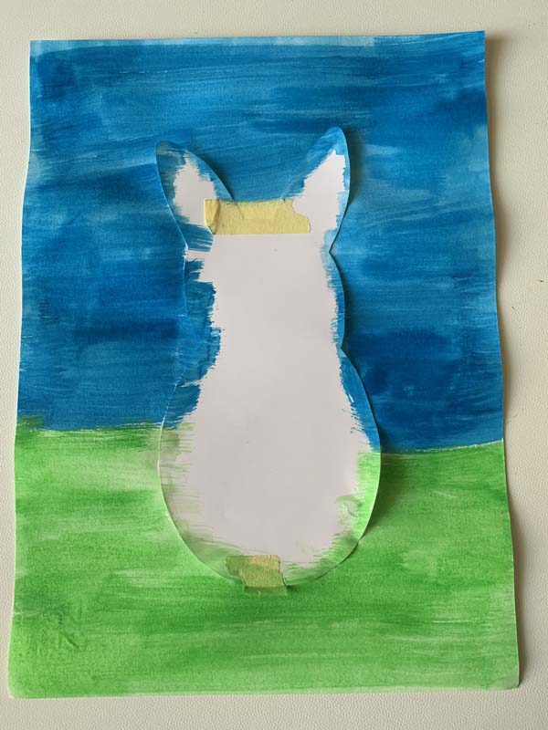 Attaccare la sagoma del coniglio al cartoncino bianco con due pezzettini di scotch di carta (in alto e in basso), poi con la tecnica che preferiamo, pitturare intorno alla sagoma utilizzando tutta la nostra fantasia, nella foto di esempio abbiamo cercato di ricreare un coniglietto in mezzo ad un bel prato verde.