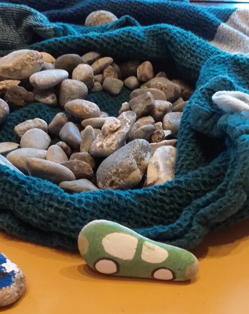 - Prendiamo le tempere e o con mani o con pennello coloriamo tutto il sasso