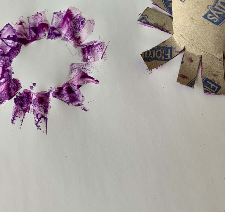 Con l’aiuto di un adulto andiamo a creare il timbro; tagliare il rotolo creando degli spicchi, cercando di mantenere una distanza più o meno uguale uno dall’altro, piegare gli spicchi verso l’esterno per creare i petali dei nostri fiori.