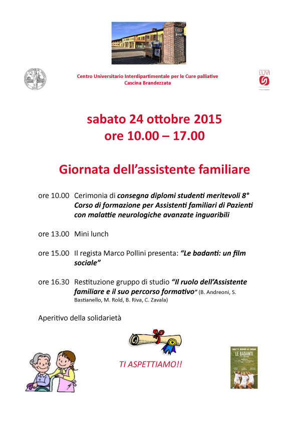Sabato 24 ottobre 2015, durante la giornata dell’Assistente familiare organizzata Centro Universitario Interdipartimentale per le Cure Palliative, la Dott.ssa Carla Piersanti, responsabile del servizio CuraMi, ha consegnato i diplomi agli studenti meritevoli che hanno completato l’8 Corso di Formazione per Assistenti Familiari di Pazienti con Malattie Neurologiche Avanzate Inguaribili. La cerimonia si e’ svolta alle ore 10 a Cascina Brandezzate ed e’ stata seguita dalla proiezione del film “Le Badanti, un Film Sociale” di Marco Pollini (h 15). L’intervento del gruppo di studio “Il ruolo dell’assistente familiare e il suo percorso formativo” (h 16.30) ha chiuso i lavori.